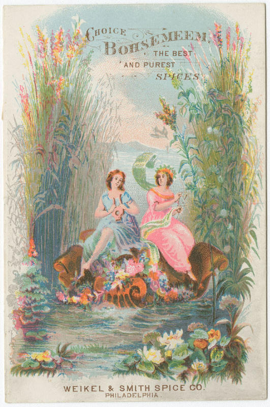 Series of illustrated trade cards depicting idyllic scenes surrounded by floral borders, including women playing stringed instruments; a couple holding a flower garland; a boy asleep and dreaming of an angel hovering over him with a cornucopia of flowers; two women, one holding a lyre, the other a triangle, sitting on a large shell in a lily pond. Business started in Philadelphia as Hummel, Bohler & Co. in 1850 and organized as a stock company under the name Weikel & Smith Spice Co. in 1867.