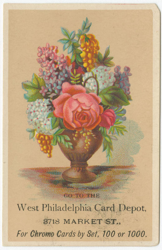 Advertising text printed on verso: Go to the West Philadelphia Card Depot, 3718 Market Street, for chromo cards, by set, 100 or 1,000 at lowest prices. School supplies, stationery, etc., etc. Printing press and outfit with script type as low as $2.50.