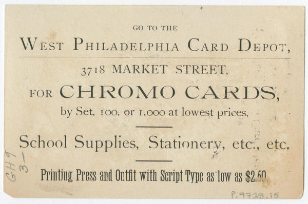 Advertising text printed on verso: Go to the West Philadelphia Card Depot, 3718 Market Street, for chromo cards, by set, 100 or 1,000 at lowest prices. School supplies, stationery, etc., etc. Printing press and outfit with script type as low as $2.50.