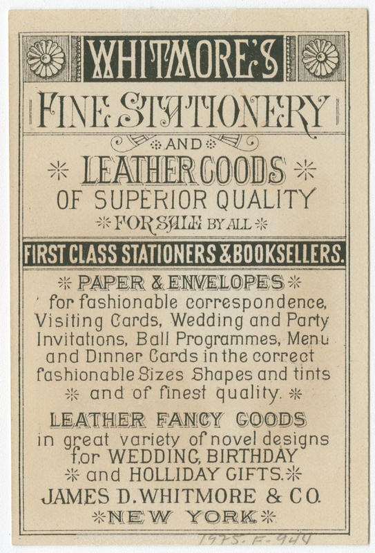 Advertising text printed on verso: Whitmore's fine stationery and leather goods of superior quality for sale by all first class stationers & booksellers. Paper & envelopes for fashionable correspondence, visiting cards, wedding and party invitations, ball programmes, menu and dinner cards in the correct fashionable sizes, shapes and tints and of finest quality. Leather fancy goods in great variety of novel designs for wedding, birthday and holliday gifts. James D. Whitmore & Co., New York.