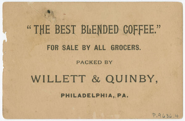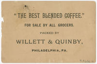 Advertising text printed on versos promotes Willett & Quinby's coffee as the "favorite" coffee and "the best blended coffee".