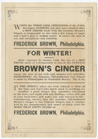 Advertising text printed on versos promotes Brown's Ginger product for family medicine purposes, for "the dyspeptic, and to those who are predisposed to gout or rheumatic affections...and to the inebriate who wishes to reform." Also promotes Brown's Ginger in the fall for comfort from the "first cool chilliness", the winter for the skin "to act well" and in the spring "to add to your back-bone, and make you take interest in life".