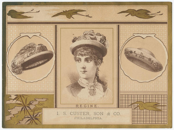 Illustrated trade card for the millinery and fancy goods store of I.S. Custer, Son & Co. in Philadelphia depicting a head portrait of a woman, Regine, wearing a hat flanked by vignettes of hats. Includes cranes in the top and bottom panels.