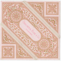 Illustrated trade card depicting pink and gilt flowering vines.