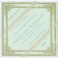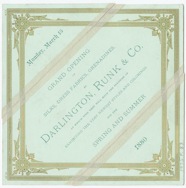 Advertising text printed on verso: Monday, March 15, Grand Opening of silks, dress fabrics, grenadines, by Darlington, Runk & Co. at which time they will have the pleasure of exhibiting the very newest styles and colorings for the spring and summer 1880.
