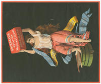 Illustrated trade card depicting a woman attired in a sheer white blouse that exposes the upper half of her body. She holds over her head a box of Shirrell's Kulliyun Washing Crystal and props her right foot next to a washboard on an overturned washtub. Draped over her arm is a multi-colored banner reading "the great labor saver".
