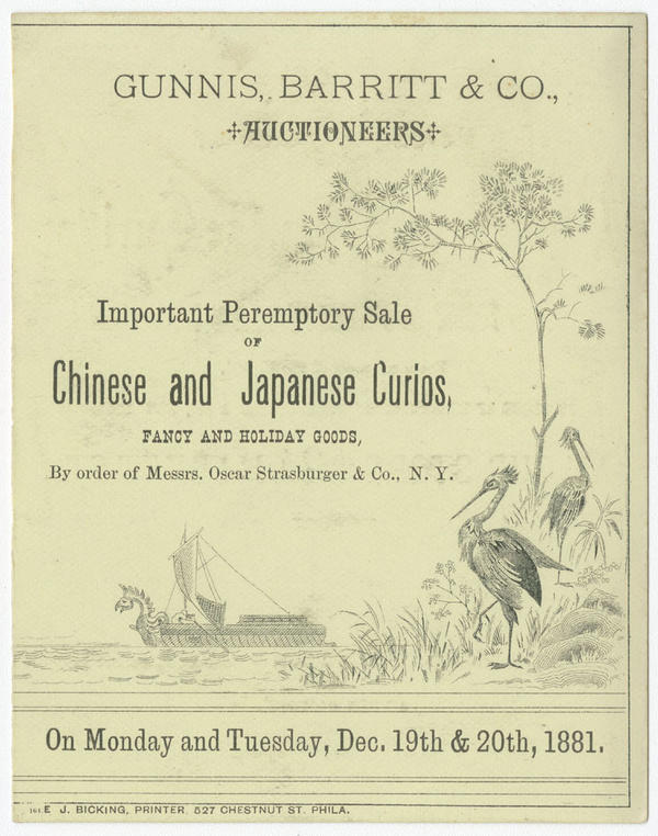Advertising text promoting the sale of Chinese and Japanese lacquer goods by auctioneers Gunnis, Barritt & Co. at 524 Market Street printed on versos.
