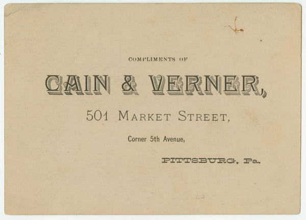 Contains advertising text printed on verso: Compliments of Cain & Verner, 501 Market Street, corner 5th Avenue, Pittsburg, Pa.