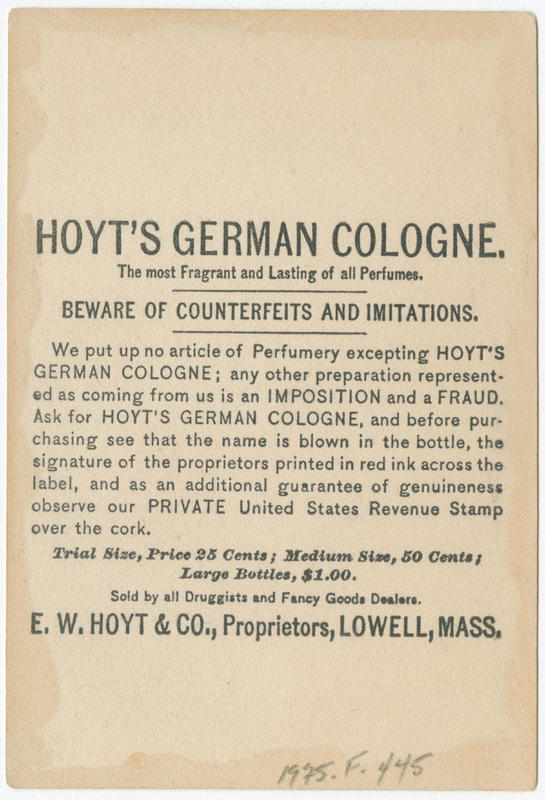 Advertising text promoting Hoyt's German cologne printed on versos.