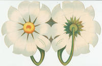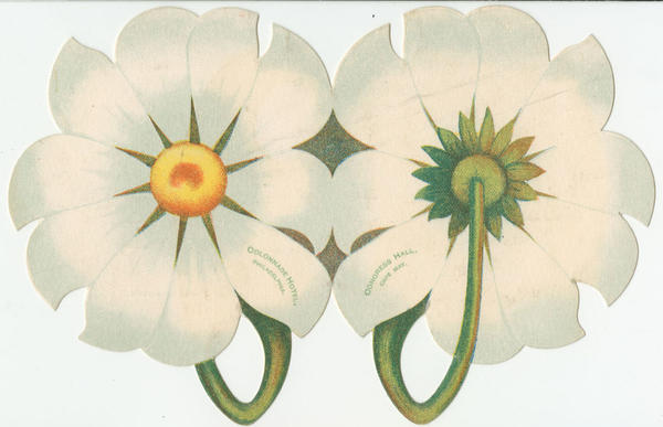 Die cut trade card shaped and illustrated as the front of one daisy and the back of another. Advertises the luxury hotels The Colonnade Hotel and Congress Hall. The Colonnade Hotel was a luxury hotel completed in 1868 at 1500-1506 Fifteenth Street (southwest corner of Fifteenth and Chestnut streets). The hotel was named after the "Colonnade Row" of early nineteenth-century pillared, porched townhouses previously on the site. The hotel was demolished in 1925 for the erection of the Franklin Trust Company Building. Congress Hall, one of the oldest seaside hotels, was built in 1816 by Thomas Hughes, at Beach Drive and Congress Street. The hotel, originally called the "Big House," was renamed Congress Hall in 1828 when Hughes was elected to Congress. The grand lodging, able to accommodate 1000 guests, was destroyed by the great fire of 1878 and rebuilt in brick the following year.