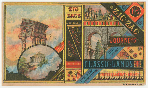 Series of illustrated trade cards for Boston publisher Estes & Lauriat promoting illustrated childrens' books "Zig Zags Journeys in Classic Lands," "The Knockabout Club in the Woods," and "Zig Zags Journeys in Europe" depicting vignettes including Grecian ruins, scenes of camp life and the outdoors, and travellers and European townscapes.