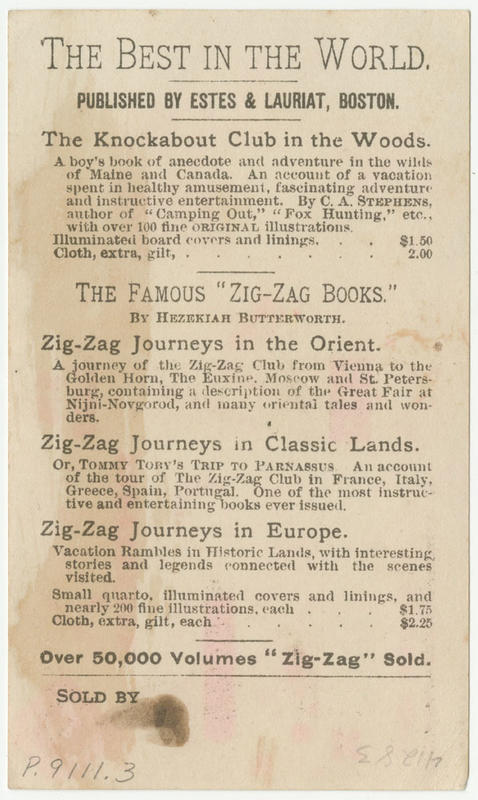 Series of illustrated trade cards for Boston publisher Estes & Lauriat promoting illustrated childrens' books "Zig Zags Journeys in Classic Lands," "The Knockabout Club in the Woods," and "Zig Zags Journeys in Europe" depicting vignettes including Grecian ruins, scenes of camp life and the outdoors, and travellers and European townscapes.