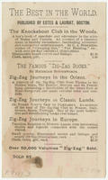 Advertising text for "The Knockabout Club in the Woods" and a list of the famous "Zig-Zag Books" by Hezekiah Butterworth printed on versos.