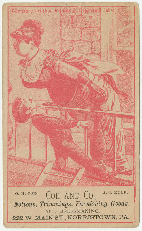 Wherefore art thou Romeo? (Romeo & Juliet.) [graphic] : Coe and Co., notions, trimmings, furnishing goods and dressmaking, 222 W. Main St., Norristown, Pa. G.H. Coe. J.C. Kulp.