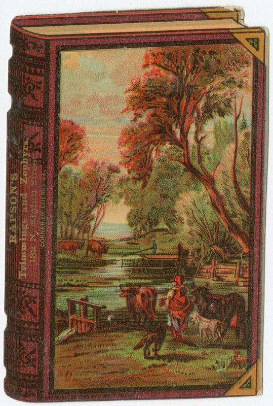 Illustrated trade card die-cut and shaped into a bound book with an illustration on the cover depicting a bucolic scene of a man leading animals to a tree-lined stream. A man fishes in the stream in the distance and cattle approach the water on the opposite bank.