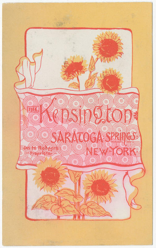 Series of illustrated trade cards depicting sunflowers behind a banner displaying the title, a spray of flowers and a bird. James H. Rodgers constructed the Kensington Hotel in Saratoga Springs, New York in 1881 and sold it to Paul C. Grening in 1887.