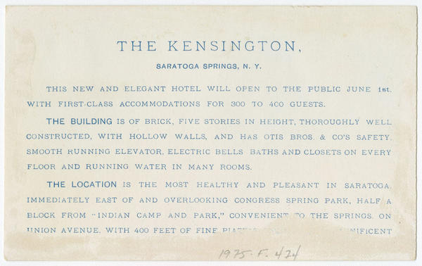 Advertising text printed on versos spans both cards. Describes amenities offered by The Kensington in Saratoga Springs, N.Y.