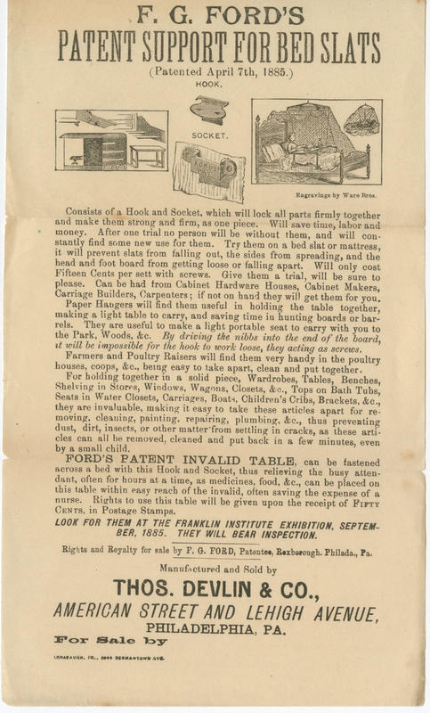 F.G. Ford's patent support for bed slats (patented April 7th, 1885.) Manufactured and sold by Thos. Devlin & Co., American Street and Lehigh Avenue, Philadelphia, Pa. [graphic] / Engravings by Ware Bros.