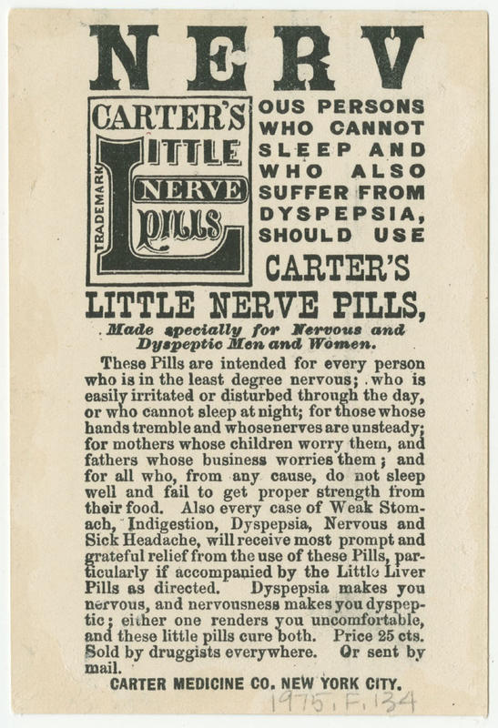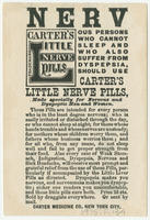 Advertising text printed on versos for products made and sold by Carter Medicine Co., including "Carter's little nerve pills" and "smart weed and belladonna back ache pilasters".