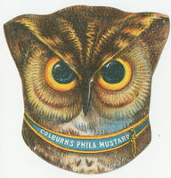 Illustrated die cut trade cards shaped into a dog and an owl with the label "Colburn's Phila. mustard" printed on the animals' collars. Connecticut-native Arthur T. Colburn began his spice business ca. 1856 in Philadelphia.