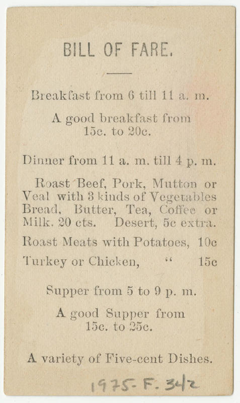 Series of illustrated trade cards depicting business cards for Frank Forney's dining rooms inset into sprigs of flowers.