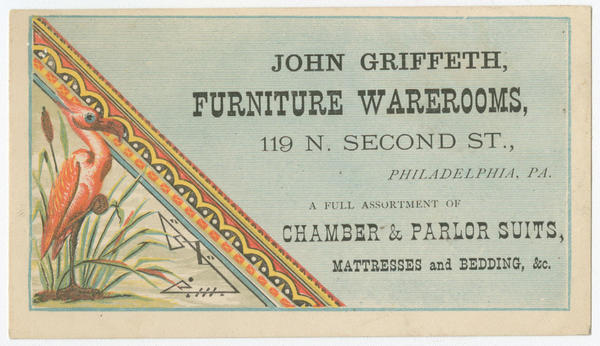 John Griffeth, furniture warerooms, 119 N. Second St., Philadelphia, Pa. [graphic] : A full assortment of chamber & parlor suits, mattresses and bedding, &c.