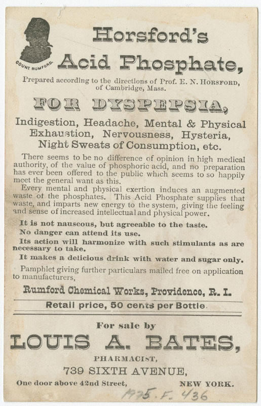 Advertising text printed on verso promotes Horsford's acid phosphate for dyspepsia, indigestion, headache, mental & physical exhaustion, nervousness, hysteria, and night sweats of consuption. Sold by Louis A. Bates, pharmacist, 739 Sixth Avenue, one door above 42nd Street, New York.