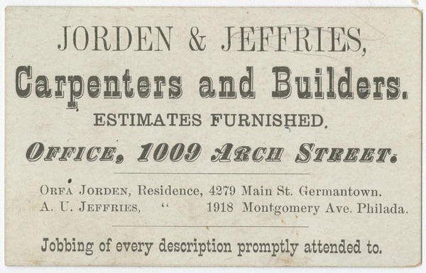 Jorden & Jeffries, carpenters and builders. Estimates furnished. Office, 1009 Arch Street. Orfa Jorden, residence, 4279 Main St. Germantown. A.U. Jeffries, residence, 1918 Montgomery Ave. Philada. [graphic] : Jobbing of every description promptly attended to.