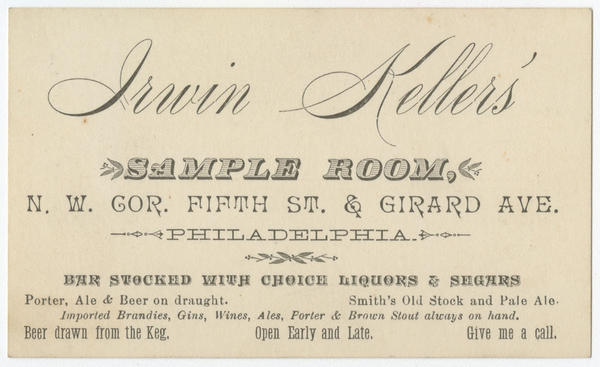 Irwin Keller's sample room, N.W. cor. Fifth St. & Girard Ave., Philadelphia. [graphic] : Bar stocked with choice liquors & segars. Porter, ale & beer on draught. Smith's Old Stock and Pale Ale. Imported brandies, gins, wines, ales, porter & brown stout always on hand. Beer drawn from the keg. Open early and late. Give me a call.