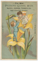 Illustrated trade card depicting a boy and a girl standing on large daffodil petals. The boy holds the girl's hands to help her down from a taller flower.