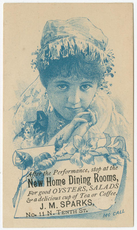 After the performance, stop at the New Home Dining Rooms, for good oysters, salads & a delicious cup of tea or coffee. J.M. Sparks, No. 11 N. Tenth St. [graphic].