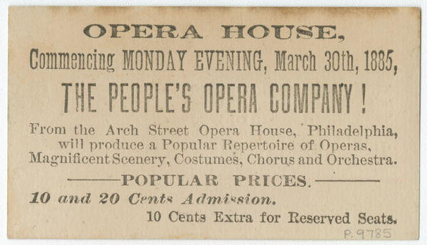 Advertising text printed on verso: Opera house, commencing Monday evening, March 30th, 1885, the People's Opera Company! From the Arch Street Opera House, Philadelphia, will produce a popular repertoire of operas, magnificent scenery, costumes, chorus and orchestra. Popular prices. 10 and 20 cents admission. 10 cents extra for reserved seats.