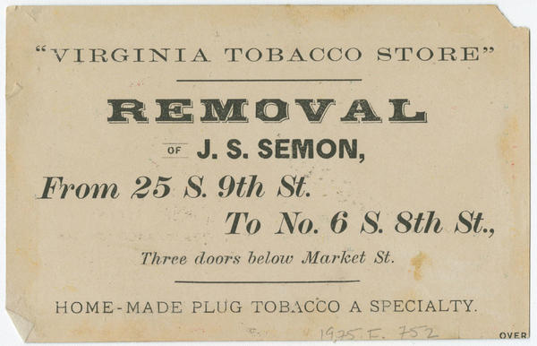 Advertising text printed on verso: "Virginia Tobacco Store" ; Removal of J.S. Semon, from 25 S. 9th St. to No. 6 S. 8th St., three doors below Market St. Home-made plug tobacco a specialty.