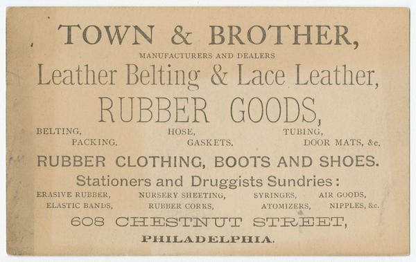 Town & Brother, manufacturers and dealers leather belting & lace leather, rubber goods, belting, packing, hose, gaskets, tubing, door mats, &c. Rubber clothing, boots and shoes. Stationers and druggists sundries: erasive rubber, elastic bands, nursery sheeting, rubber corks, syringes, atomizers, air goods, nipples, &c. 608 Chestnut Street, Philadelphia. [graphic].