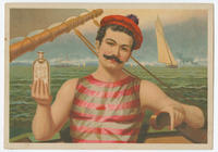 Illustrated trade card depicting a sailor steering a boat with his left hand and holding a bottle of Dr. Starkey & Palen's Compound in his right. He wears a red and black striped shirt and a red beret.