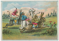 Illustrated trade card depicting monkeys dressed as jockeys racing on the backs of three rabbits through a field. Also includes vignettes of the rear adjusting and the front adjusting plows on verso.