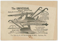 Advertising text printed on verso: The Universal patent front and rear adjusting plows. General purpose for two or three horses. All parts interchangeable in steel or chilled iron. Repairs always fit. The lightest draft, the best work, adjustments unsurpassed, no wrench, no trouble, no lost time. Send for circular. Manufactured by The Universal Plow Co., Canton, Ohio.