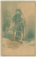 Illustrated trade card depicting a man in medieval clothing, including a cloak, fur cap with a feather, tights, and sword, holds and inspects a skull in his right hand.
