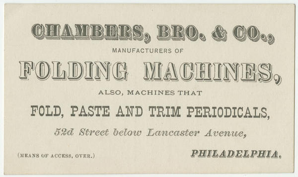 Chambers, Bro. & Co., manufacturers of folding machines, also, machines that fold, paste and trim periodicals, 52d Street below Lancaster Avenue. Philadelphia. (Means of access, over.) [graphic].