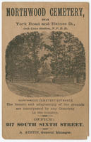 Northwood Cemetery entrance. The beauty and adaptibility of the grounds are unsurpassed by any cemetery in the country. [graphic] : Northwood Cemetery, near York Road and Haines St., Oak Lane Station, N.P.R.R. Office: 217 South Sixth Street. A. Austin, general manager.