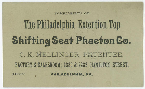 Compliments of the Philadelphia Extention Top Shifting Seat Phaeton Co. C.K. Mellinger, patentee. Factory and salesroom; 2230 & 2232 Hamilton Street, Philadelphia, Pa. [graphic].