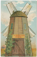 Illustrated, metamorphic trade card depicting a windmill with panels that open to show bags and a barrel of "Superlative" and "Gold Medal" flour in the foreground and in the background, a bird's eye view of the Washburn-Crosby Co.'s flour mill complex, including "Mill C Elevator", adjacent to the St. Anthony Falls in Minneapolis, Minnesota. Also shows a train crossing the Mississippi River near the falls on the curved Stone Arch Bridge, which was built in 1883 by railroad tycoon James J. Hill for his Great Northern Railway. Cadwallader C. Washburn's business began as the Minneapolis Milling Company at the St. Anthony Falls site ca. 1856. John Crosby entered the partnership in 1877. Consolidated into General Mills in 1928 with twenty-six other national mills.