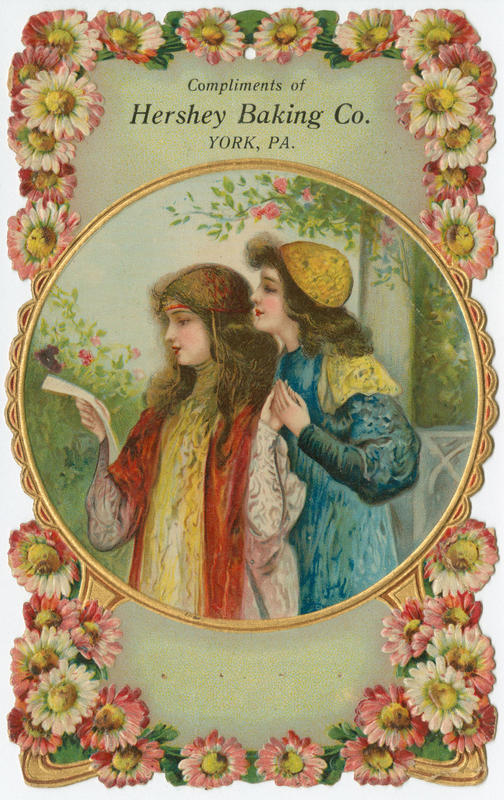 Illustrated trade card surrounded by a flower border depicting the profiles of two women in Renaissance robes reading a letter in a garden. Hershey Baking Company was founded by Jacob S. Hershey in 1899 as a bread bakery in York, Pennsylvania.