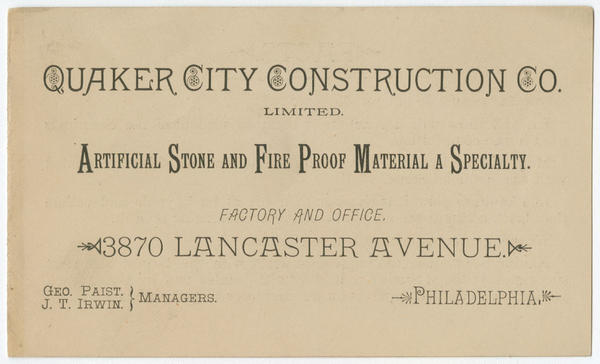 Quaker City Construction Co. limited. Artificial stone and fire proof material a specialty. Factory and office. 3870 Lancaster Avenue. Philadelphia. [graphic] : Geo. Paist, J.T. Irwin, managers.