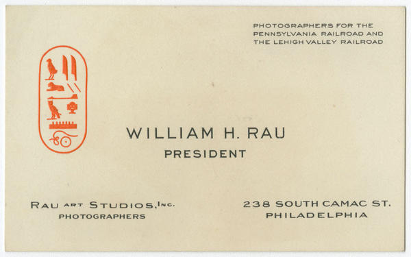Illustrated business card depicting tiny embossed orange vignettes of an owl, lion, bird and instruments within an oval formed by a single orange line. Rau served as the official photographer for the Pennsylvania Railroad beginning in 1891 and the Lehigh Valley Railroad in 1895. Rau, a professional Philadelphia photographer, began his career as assistant to Philadelphia photographer William Bell; served as the primary photographer of E.L. Wilson's Middle East photographic expedition (1881-1882); and was sole proprietor of a prolific photographic studio that issued lantern slides, stereographs, and photographs between 1887 and 1920. He was also official photographer of the Louisiana Purchase Exposition of 1904, a director of the Photographic Society of Philadelphia, a president of the Pennsylvania Photographic Society, and a member of the Pennsylvania Academy of Natural Sciences.