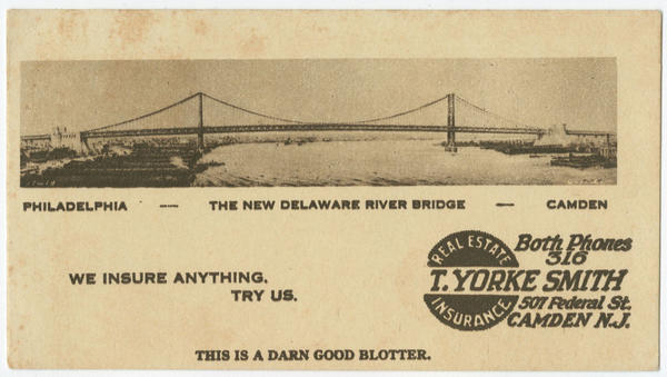 Philadelphia -- The new Delaware River Bridge -- Camden. We insure anything. Try us. This is a darn good blotter. T. Yorke Smith, 507 Federal St., Camden N.J. Real estate insurance. Both phones 316. [graphic].