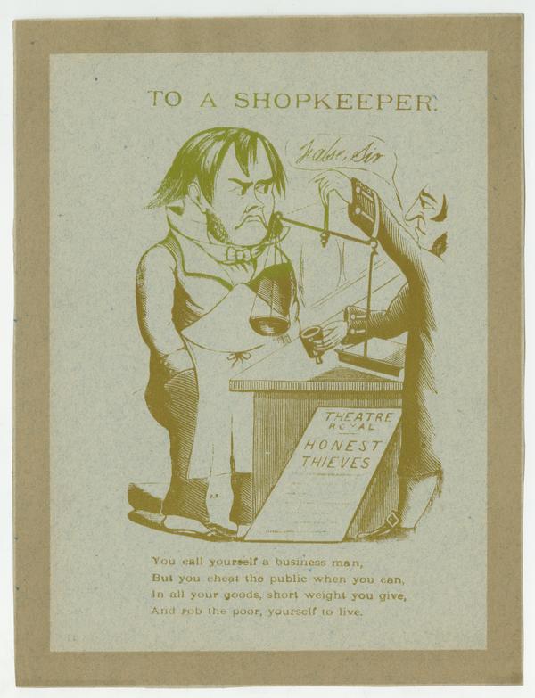 Text: You call yourself a business man, / But you cheat the public when you can, / In all your goods, short weight you give, / And rob the poor, yourself to live.