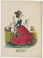 A woman with a long nose holds a bonnet. Other millinery articles sit on a table behind her and a piar of scissors hangs from her waist.