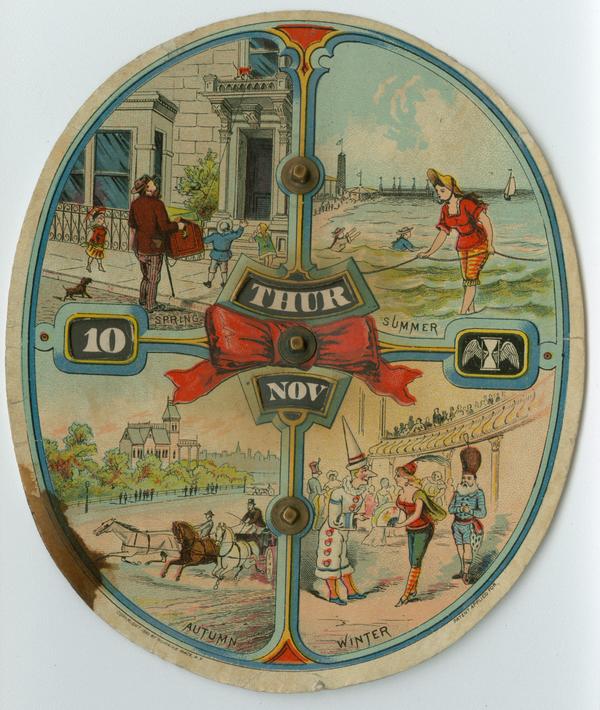 Illustrated mechanical calendar containing four genre scenes representing "Spring," "Summer," "Autumn," and "Winter." Spring scene shows an organ grinder watching his "escaped" monkey walk across the balustrade portico of a city residence under the gaze of excited children. Summer scene shows a woman in bathing attire wading in the ocean. Piers are visible in the background. Autumn scene shows a horse-trotting race. Winter scene shows a masquerade ball. Also contains a vignette showing an hour glass adorned with wings and a pictorial detail depicting a ribbon at the center.