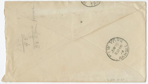 Contains on verso: calculation in pencil and ink-stamp postmark: New York June 25 8 30 AM.. |